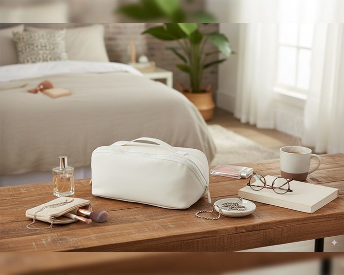 Cosmetiquera / neceser de viaje rectangular con asa y cierre cruzado, que le da mayor amplitud, permitiendo abrirlo en su totalidad. En su interior cuenta con forro, 3 bolsas laterales con resorte, 2 pequeñas de un lado y 1 del otro lado, además de un bolsillo central transparente con cierre.Cosmetiquera / neceser de viaje rectangular con asa y cierre cruzado, que le da mayor amplitud, permitiendo abrirlo en su totalidad. En su interior cuenta con forro, 3 bolsas laterales con resorte, 2 pequeñas de un lado y 1 del otro lado, además de un bolsillo central transparente con cierre.