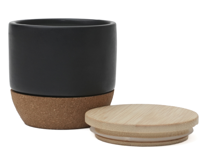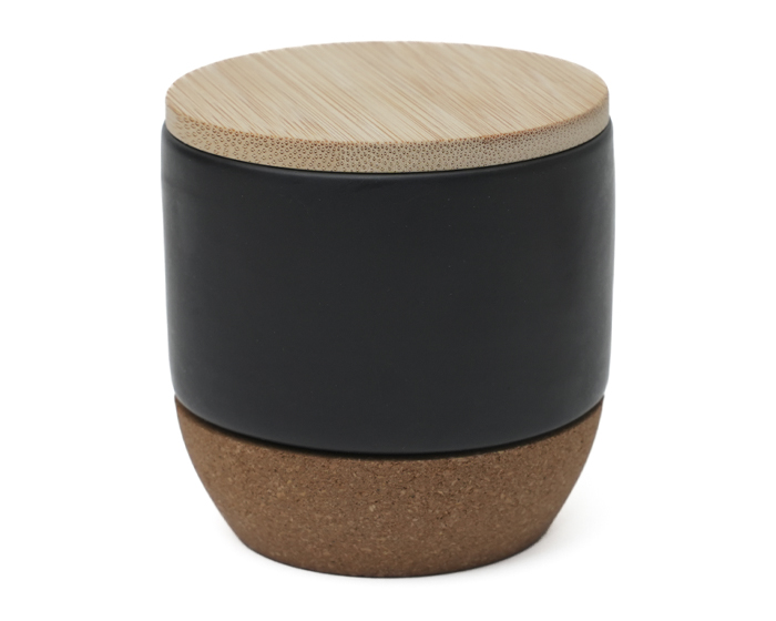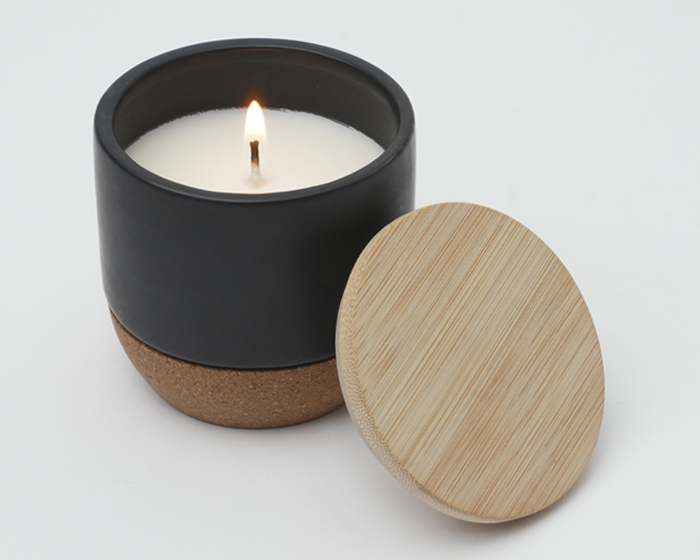 Vela decorativa de cera blanca de soya con concentración de fragancia de vainilla al 2%, en tarro de cerámica con tapa de bambú y base de corcho. Presentación: caja individual.Vela decorativa de cera blanca de soya con concentración de fragancia de vainilla al 2%, en tarro de cerámica con tapa de bambú y base de corcho. Presentación: caja individual.